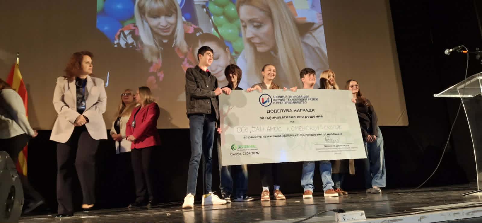 Меѓу бројната конкуренција, тимот на ООУ „Јан Амос Коменски“ денеска постигна огромен успех освојувајќи ја првата награда во категоријата за Најиновативно еко решение, во рамки на еднодневниот настан „Зеленикс – од предизвик до иновација“, кој го организираше Агенцијата за иновации научно- технолошки развој и претприемништво – ИНОВА.