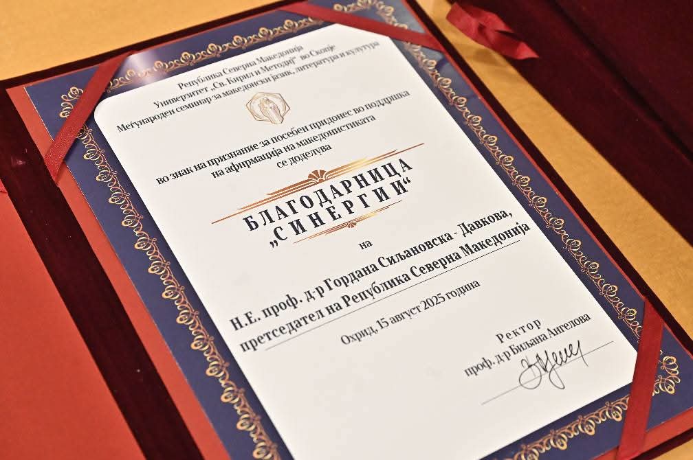 На претседателката Гордана Сиљановска-Давкова, ректорката Ангелова и ја додели благодарницата Синергии“, во знак на признание за посебен придонес во поддршка на афирмација на македонистиката.