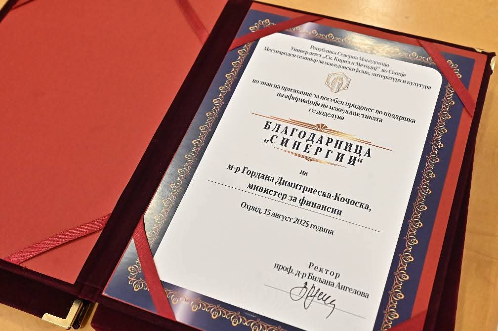 На Гордана Димитриеска-Кочоска, министерка за финансии, Ректорката Ангелова и го додели признанието „Синергии“, во знак на признание за посебен придонес во поддршка на афирмација на македонистиката.