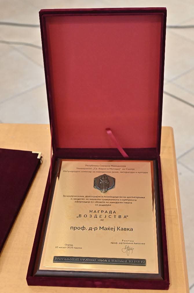 На проф. д-р Маќеј Кавка, Ректорката Ангелова му ја додели највисоката награда за македонистика, за исклучителни, долготрајни и повеќедецениски достигнувања и придонес во научноистражувачката и културната афирмација од областа на македонистиката.