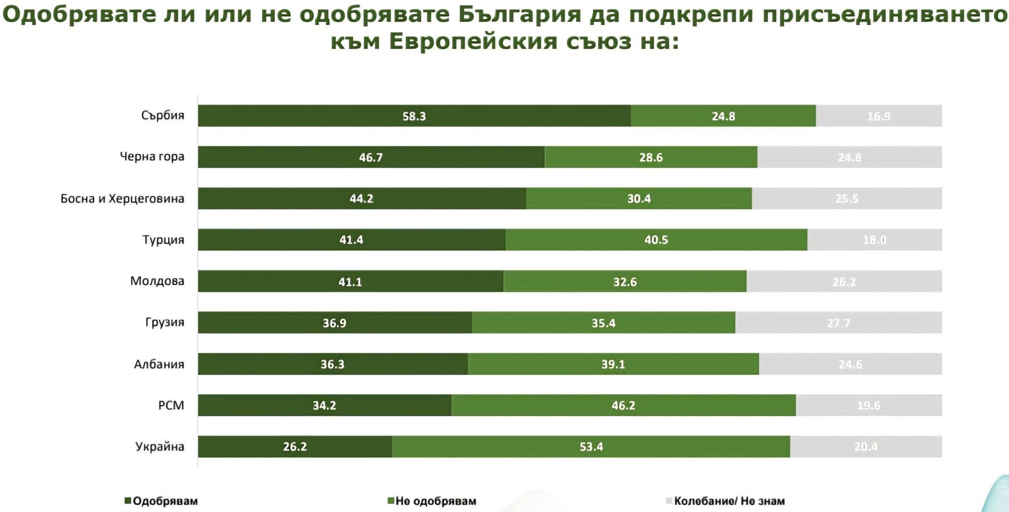 Ова го покажуваат одговорите на прашањето кои кандидати за членство во ЕУ ги поддржуваат Бугарите кои се дадени во рамки на националната репрезентативна анкета на агенцијата „Мјара“.