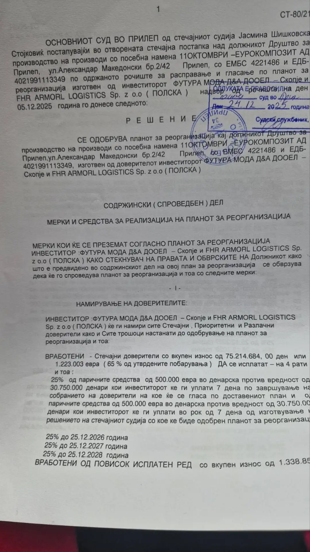 Стечајниот судија во прилепскиот суд Јасмина Шишковска го прифати нивниот план за реорганизација на „Еурокомпозит“ со што конечно е продадена наменската фабрика. Првата рата доверителите веќе ја добија.