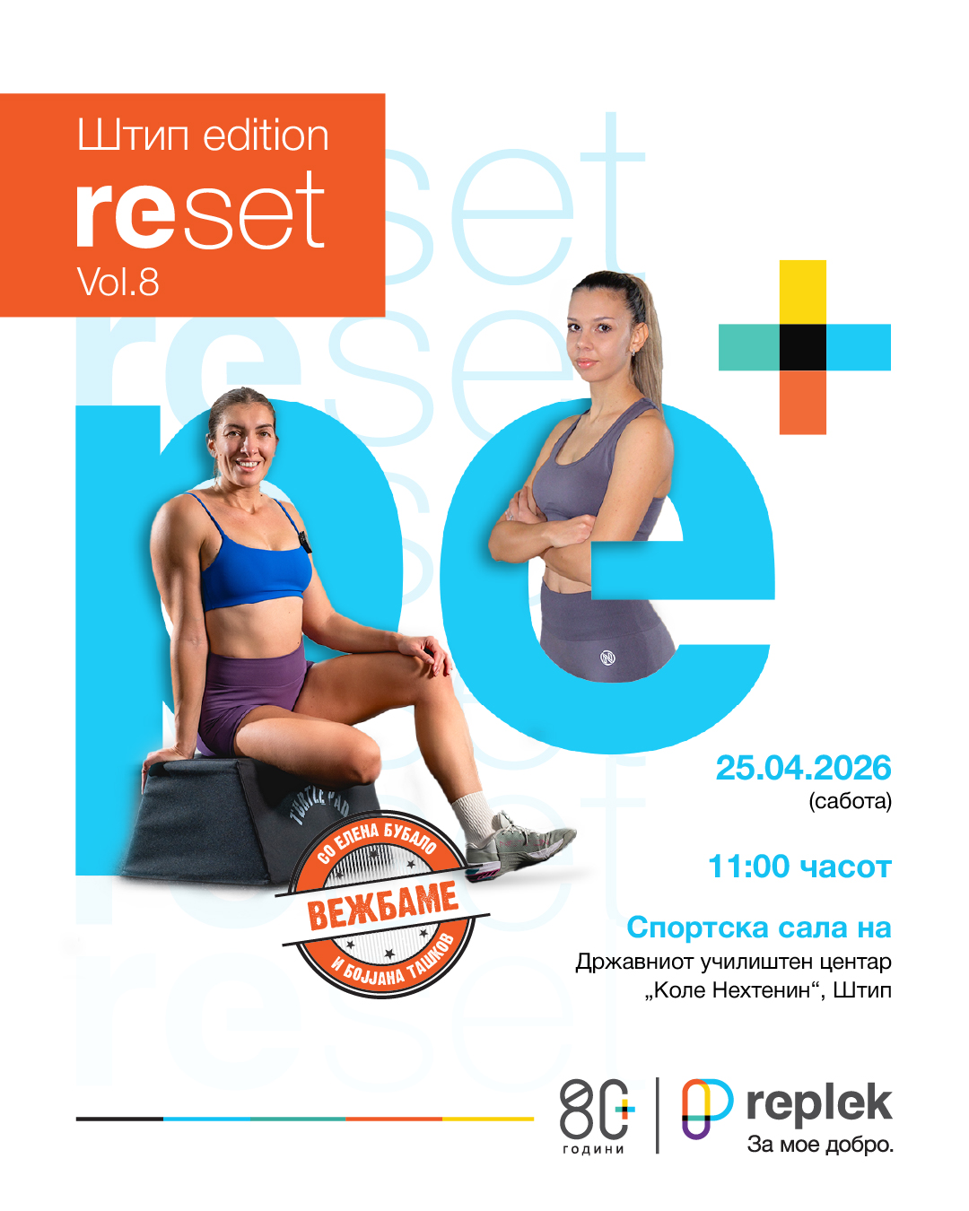 РЕсет платформата на „Реплек“ продолжува да ја шири својата инспиративна фитнес енергија низ земјава. Следна станица во рамки на серијата интерактивни активности е Штип, каде на 25 април, сабота, со почеток во 11.00 часот, во спортската сала на Државниот училиштен центар „Коле Нехтенин“, ќе се одржи осмото издание на настанот, со познатата фитнес инструкторка Елена Бубало. Со засилувањето што ќе го добие од Бојана Ташков од Штип, настанот добива силна регионална компонента и нова мотивациска димензија.