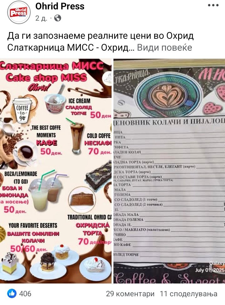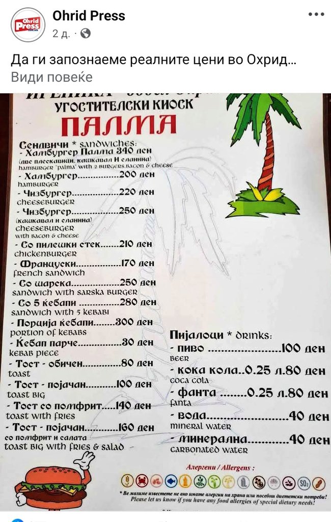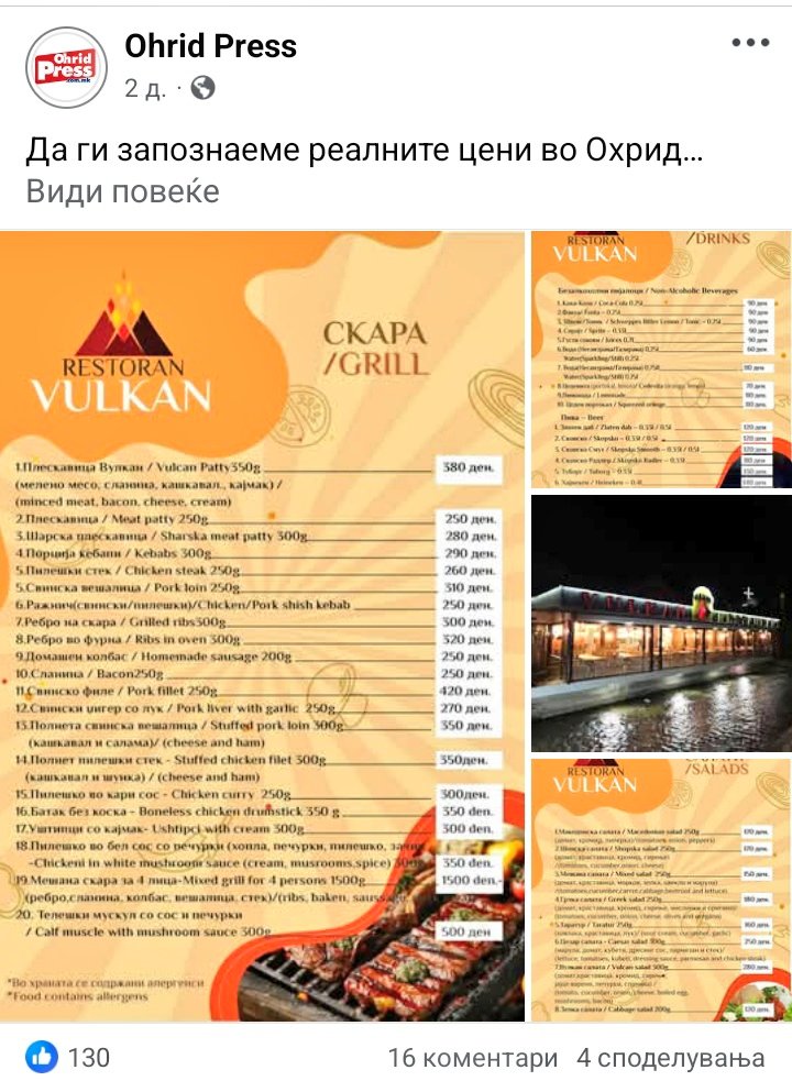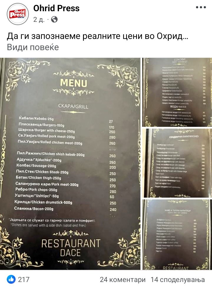 Додека во постови на социјалните мрежи дел од туристите објавуваат сметки со огромни цени од кои може да ви се сврти во главата порталот Охрид прес открива дека во Охрид голем дел од рестораните имаат сосема пристојни цени на услугите кои се пониски и од скопските.