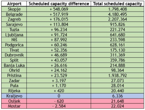 Според анализите, секој од овие два аеродрома ќе додаде повеќе од половина милион седишта во својата понуда Речиси сите аеродроми во регионот го зголемуваат својот капацитет споредено со лани, а зимската сезона ќе трае до 28 март.