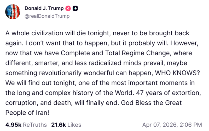 „Целата цивилизација ќе умре вечерва, за да не се врати никогаш повеќе. Не сакам тоа да се случи, но веројатно ќе се случи.“ – порача предмалку претседателот на Соединетите Американски Држави Доналд Трамп во драматичната и невообичаена објава на својата општествена мрежа „Општествена вистина“ („Truth Social“ ). Оваа заканувачка објава американскиот претседател ја изнесе денес, пред истекот на крајниот рок до 20 часот, што им го постави на иранските лидери да ја прекинат блокадата на Хормускиот теснец и да го отворат за минување на танкери со нафта, за да, како што рече, „не им се урне врз главата пеколот“.