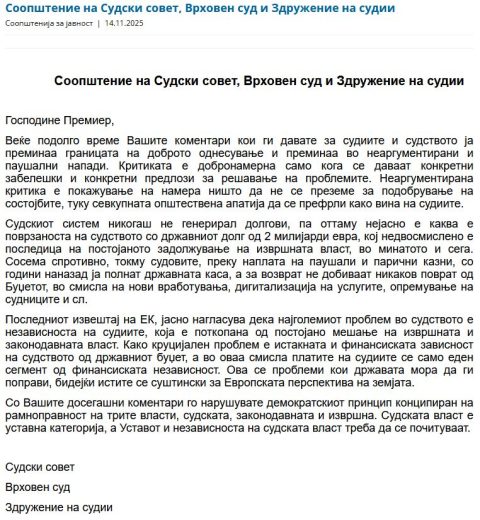 Судскиот совет, Врховниот суд и Здружението на судии објавија соопштение во кое се обраќаат до премиерот Христијан Мицкоски и го обвинуваат за „неаргументирани и паушални напади“.