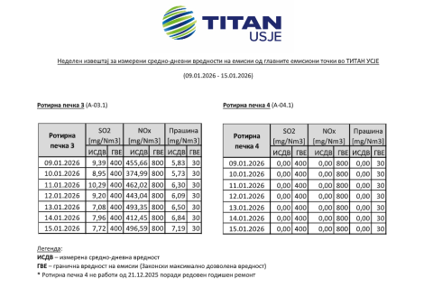 Имено, согласно домашната регулатива, која во овој сегмент е идентична со онаа на Европската унија, ТИТАН Усје како компанија носител на А-интегрирана дозвола, е под континуиран 24-часовен независен мониторинг на излезните гасови од оџаците, а резултатите од мерењата се јавно достапни (неделен извештај даден во прилог).