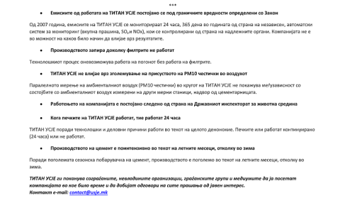 Во интерес на вистината би сакале повторно да ги истакнеме фактите дека ТИТАН Усје целосно ја почитува законската регулатива во сите области од своето работење, ги применува светските добри практики во производство на цемент и на јасен и транспарентен начин комуницира со сите засегнати страни.