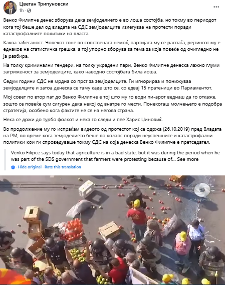 По изјавите на Венко Филипче за состојбата во земјоделството, министерот Цветан Трипуновски објави видео од масовниот протест на земјоделците од октомври 2019 година, кога СДСМ беше на власт, со пропратен текст: