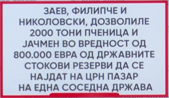 Зоран Заев, Венко Филипче и Љупчо Николовски дозволиле 2.000 тони пченица и јачмен во вредност близу 800.000 евра од државните стокови резерви да се најдат на црн пазар на една соседна држава, рече денеска Викторија Андоновска од ВМРО-ДПМНЕ.
