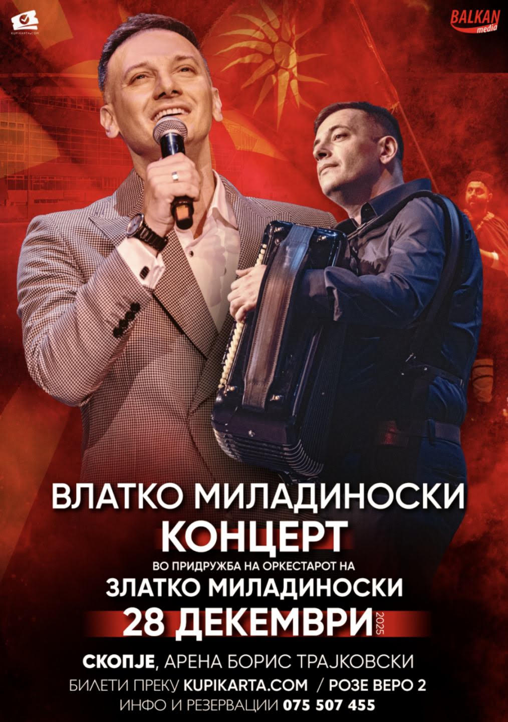 Еден од најпопуларните изведувачи на македонска народна музика, Влатко Миладиноски, на 28 декември ќе одржи голем солистички концерт во арената „Борис Трајковски“ во Скопје. На сцената секогаш е рамо до рамо со брат му Златко Миладиноски и неговиот голем оркестар, со кого заедно подготвуваат незаборавна музичка вечер исполнета со најубавите македонски песни.