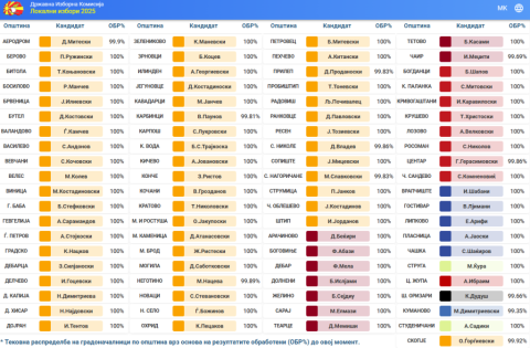 Во оваа бројка не е вклучена општина Старо Нагоричане, бидејќи во неа кандидатот на ВМРО-ДПМНЕ има точно 50 отсто освоени гласови, што е на границата потребни гласови за победа во првиот круг.