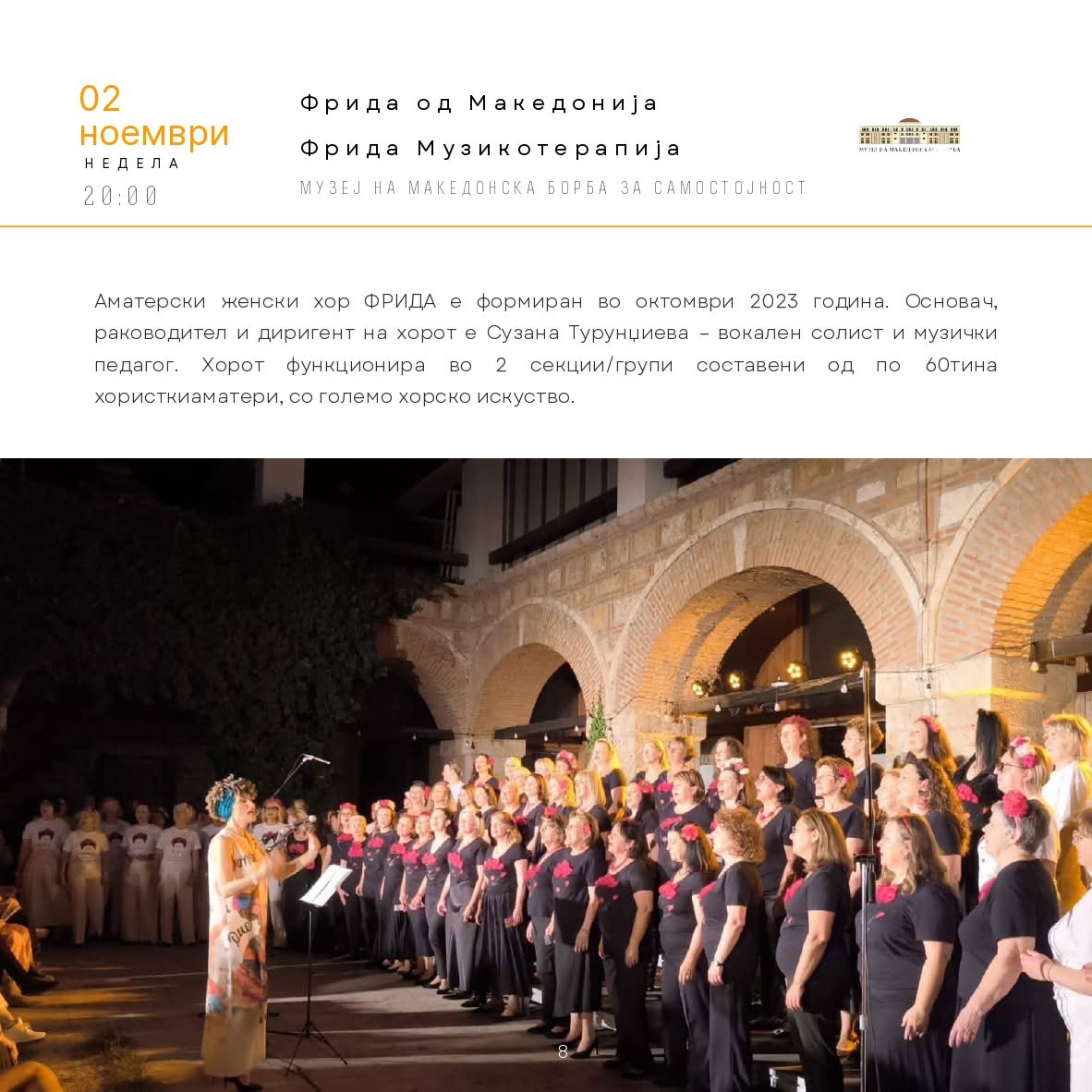 Во рамки на 25. издание на „Есенски музички свечености“ ќе се одржи концерт на женскиот хор „Фрида од Македонија“ насловен „Фрида Музикотерапија“.