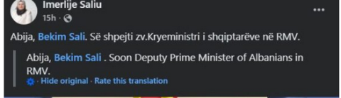 Во објава на социјалните мрежи, пратеничката Имерлије Салиу напиша: „Господинот, Беким Сали за кратко ќе биде премиер на Албанците во С. Македонија“