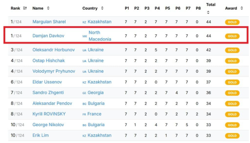 Со освоени 44 поени, Давков го делеше првото место со натпреварувач од Казахстан, но според дополнителните критериуми, токму тој е прогласен за апсолутен победник на првата ЕМО во историјата.
