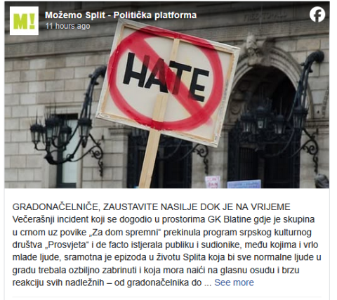 Сплитската невладина „Можемо“ исто така реагираше, наведувајќи дека вечервашниот инцидент, каде група облечена во црно извикувајќи „За татковината, подготвени“ ја прекина програмата на српското културно друштво „Просвјета“ и де факто ги избрка публиката и учесниците, е „срамна епизода во животот на Сплит“ што мора да се дочека со гласна осуда и брза реакција од сите оние на власт – од градоначалникот до полицијата.