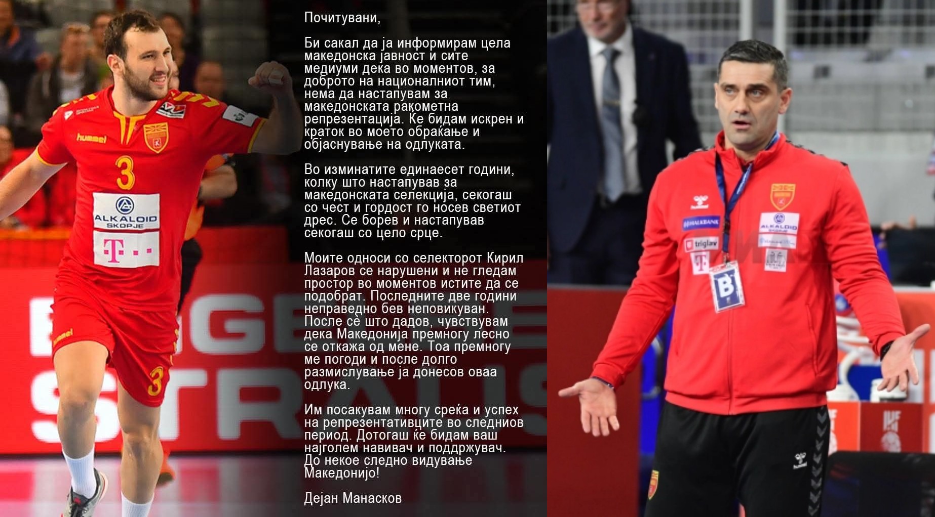 Поранешниот македонски ракометен репрезентативец Дејан Манасков преку објава на социјалните мрежи откри дека нема да игра за Македонија се додека селектор е Лазаров.
