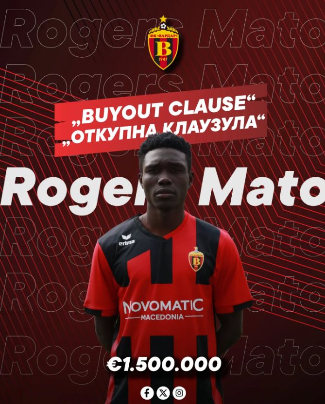 „ФК Вардар АД ја информира јавноста дека, поради зголемениот интерес од повеќе странски клубови за нашиот фудбалер Рогерс Кассим Мато, Управата на клубот донесе одлука да утврди откупна клаузула во износ од 1.500.000 евра“, се вели во клупското соопштение.