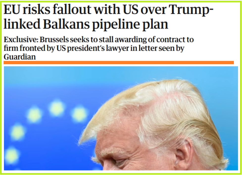 Европската Унија ризикува конфронтација со американскиот претседател Доналд Трамп откако се обиде да го одложи доделувањето на профитабилниот договор за балкански гасовод на компанија која ја застапуваат негови лични соработници, покажуваат документите до кои дошол британскиот весник „Гардијан“.