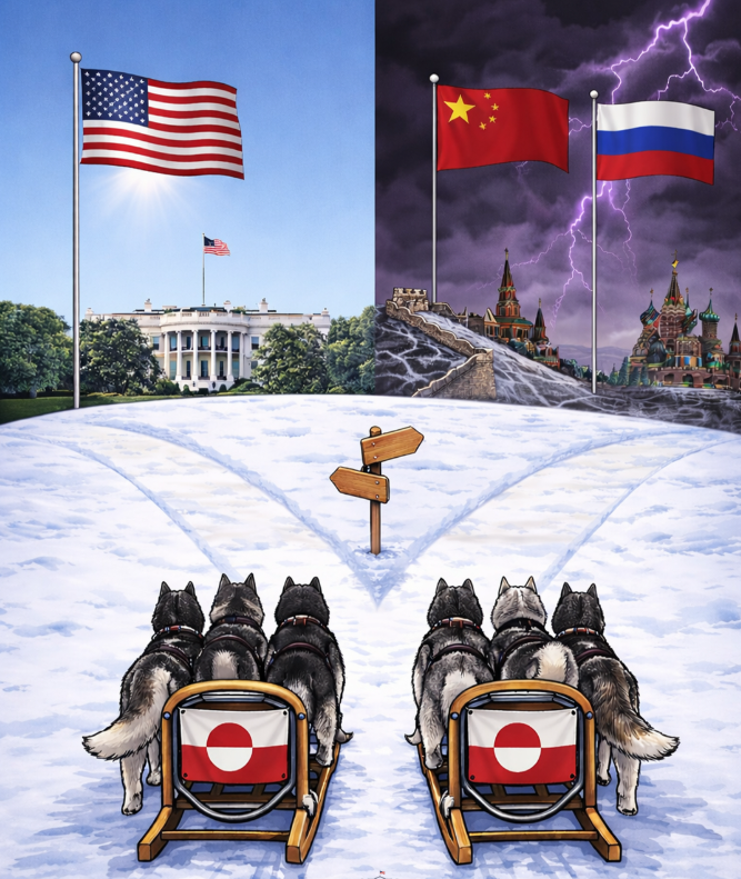 Сликата прикажува две санки со кучиња со знамето на Гренланд кои стојат на раскрсницата на патот. Едната патека води до Белата куќа под чисто сино небо, додека другата прикажува темни облаци од бура, молњи и знамињата на Русија и Кина.