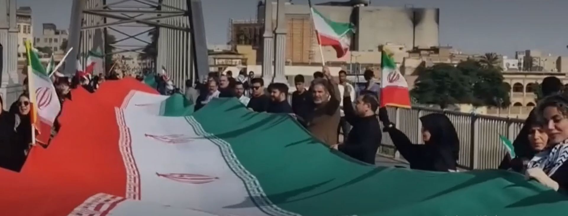 Видео објавено од иранската новинска агенција Фарс покажува луѓе кои држат големо иранско знаме преку мостот „Пол Сефид“ во Ахваз, југозападен Иран.