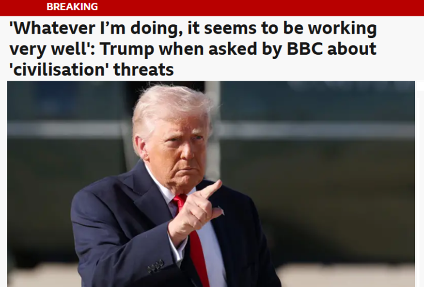 Американскиот претседател Доналд Трамп во изјава за Би-би-си истакна дека неговата стратегија во Иран функционира, одговарајќи на прашања за претходните закани што предизвикаа загриженост за можна ескалација на конфликтот. Во краткиот телефонски разговор со уредничката на „Би-би-си“ за сервисот во Северна Америка, Сара Смит, Трамп исто така ја коментираше неговата претходна изјава од овој месец во која тој предупреди дека „целата цивилизација може да исчезне преку ноќ“.