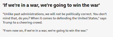 Во говорот пред војниците на носачот на авиони „УСС Џорџ Вашингтон“ во Јапонија, тој нагласи дека „нема да бидеме политички коректни кога станува збор за одбрана на Соединетите Американски Држави“.