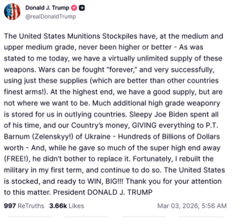 Трамп синоќа објави порака на својата платформа Truth Social во која обзнани дека САД имаат рекордни залихи на муниција со средно и високо ниво.